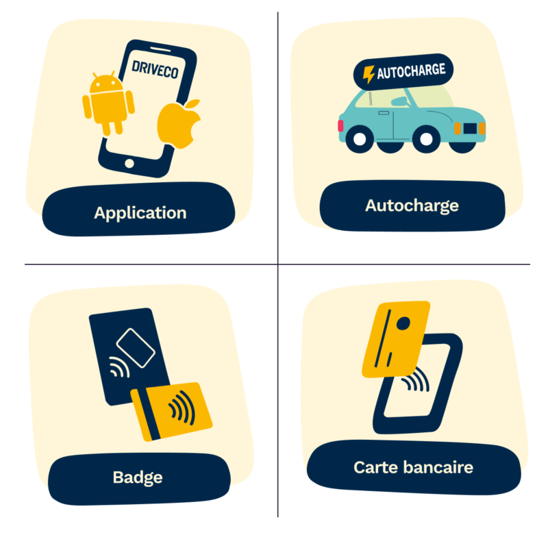Sur la borne, via l’application DRIVECO, avec un badge, une carte bleue ou via auto charge : choisissez le moyen le plus simple de lancer votre recharge
