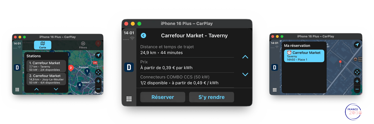 - L’utilisateur ouvre l’application depuis l’écran du véhicule et peut ainsi naviguer parmi la liste des stations DRIVECO